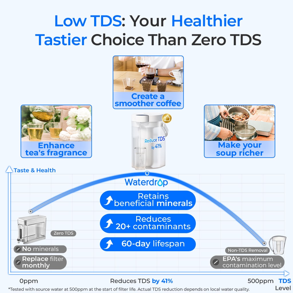 Our dispenser offers instant convenience with a touch-activated top. Water flows within one second, providing fresh, lower TDS purified water on demand—no tilting or pouring required, making it faster and easier than traditional pitchers.